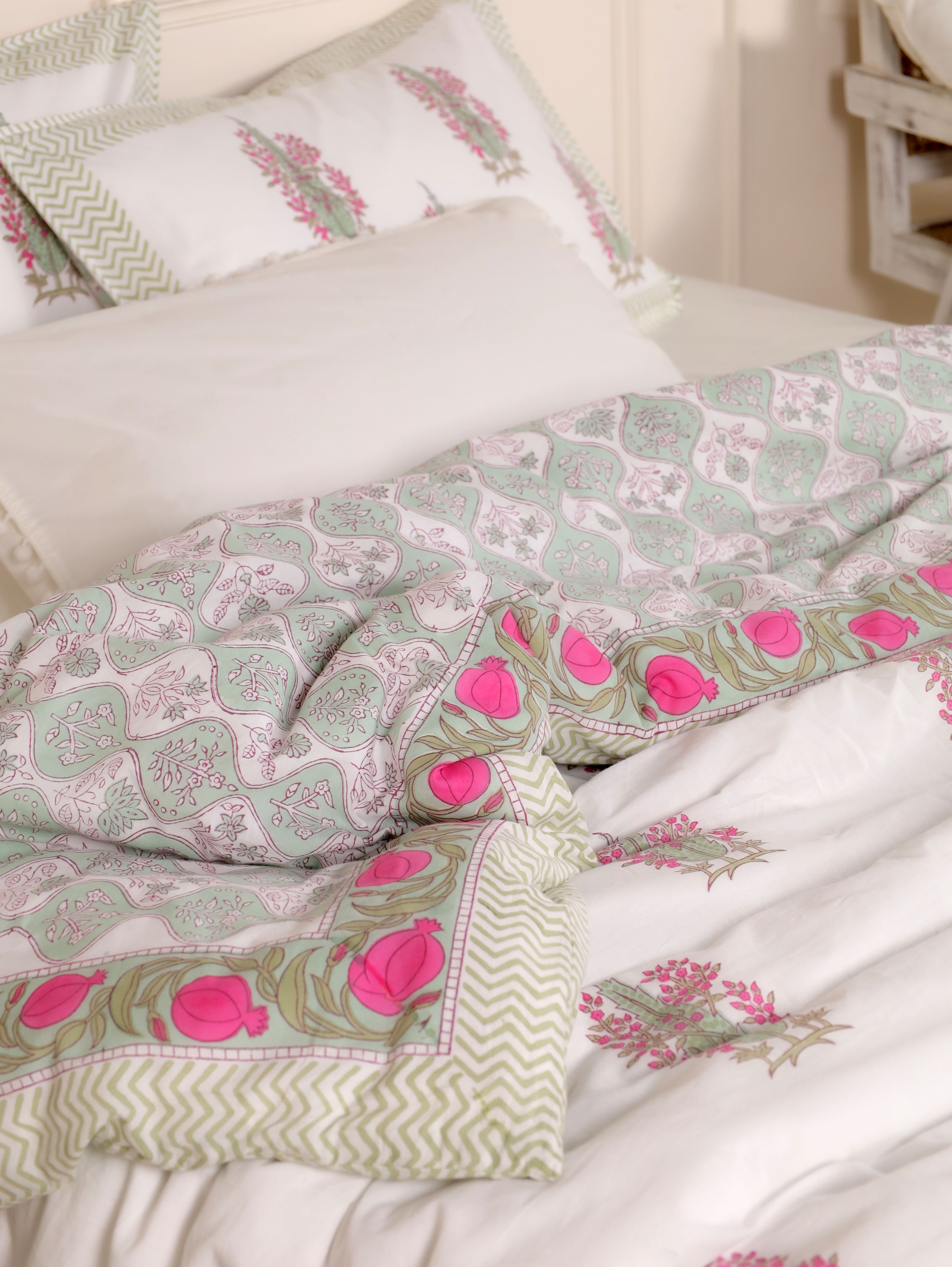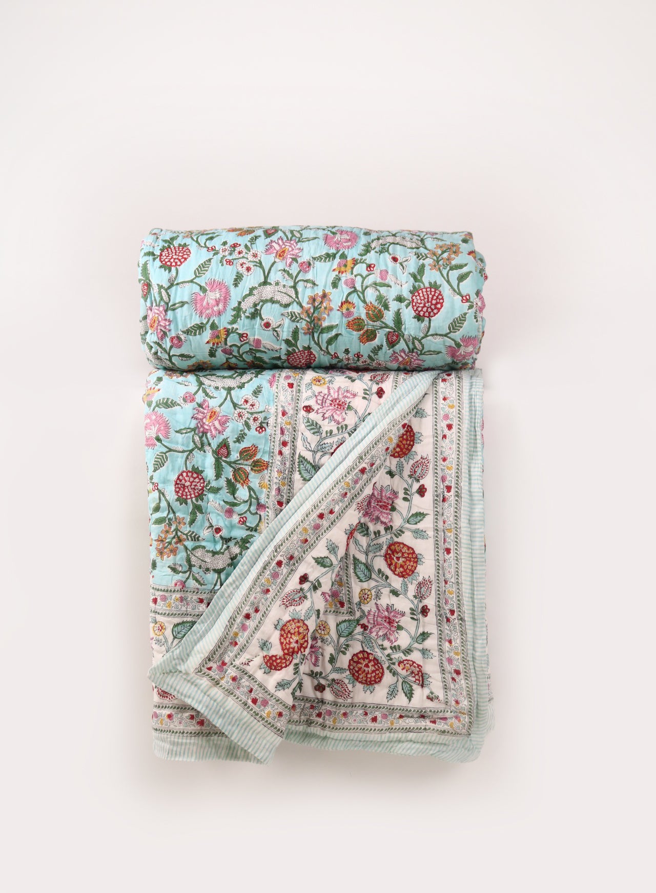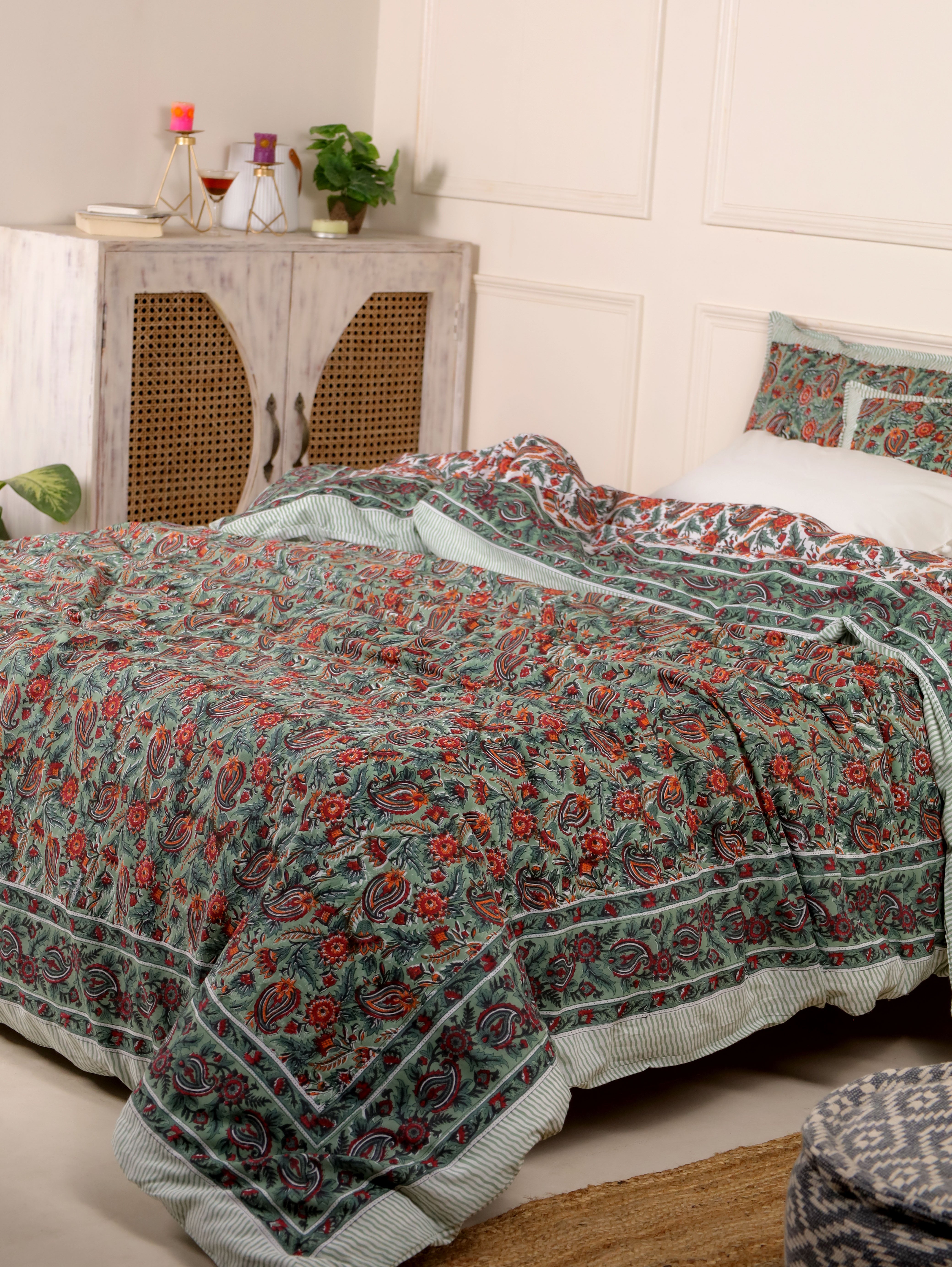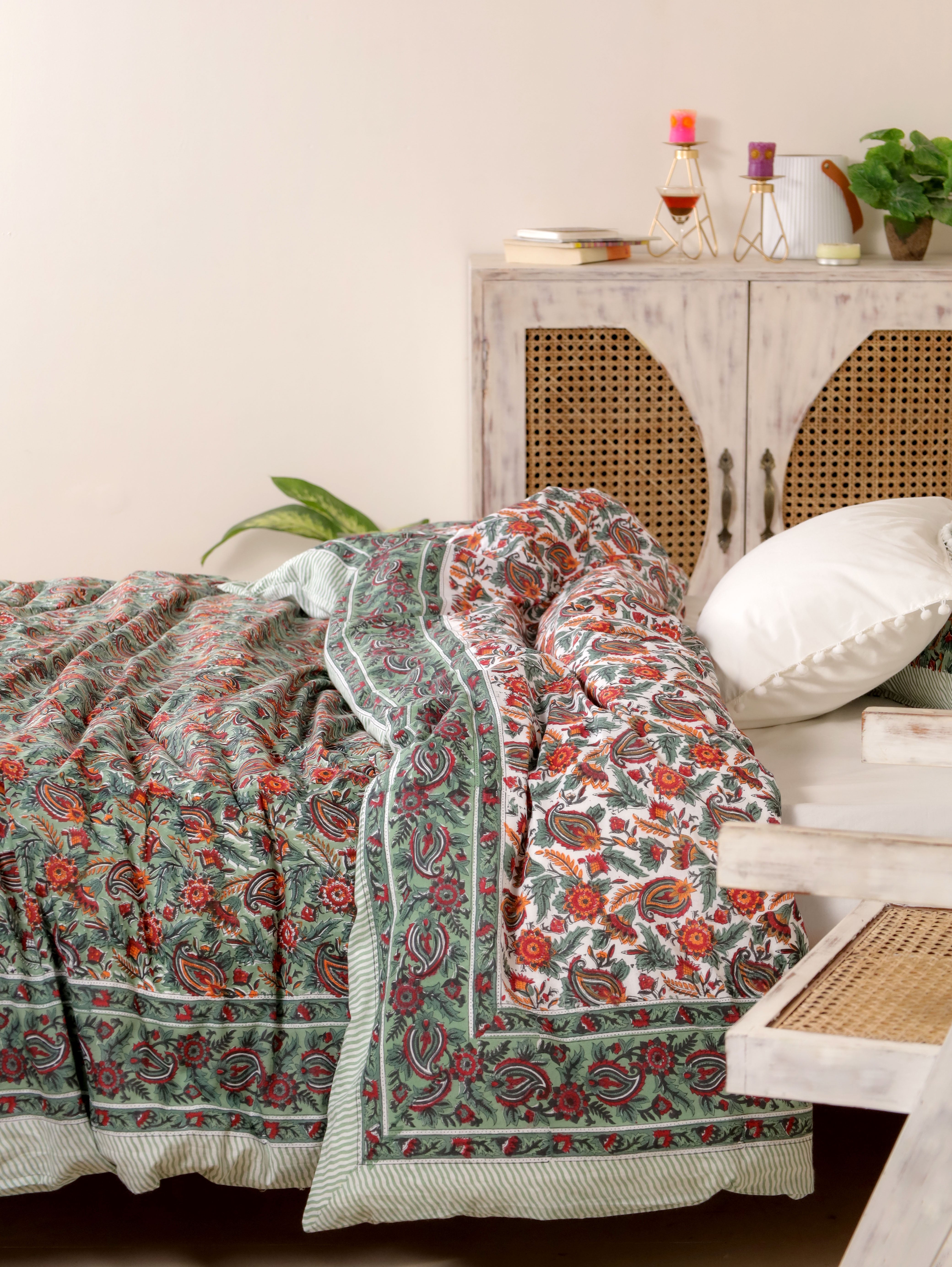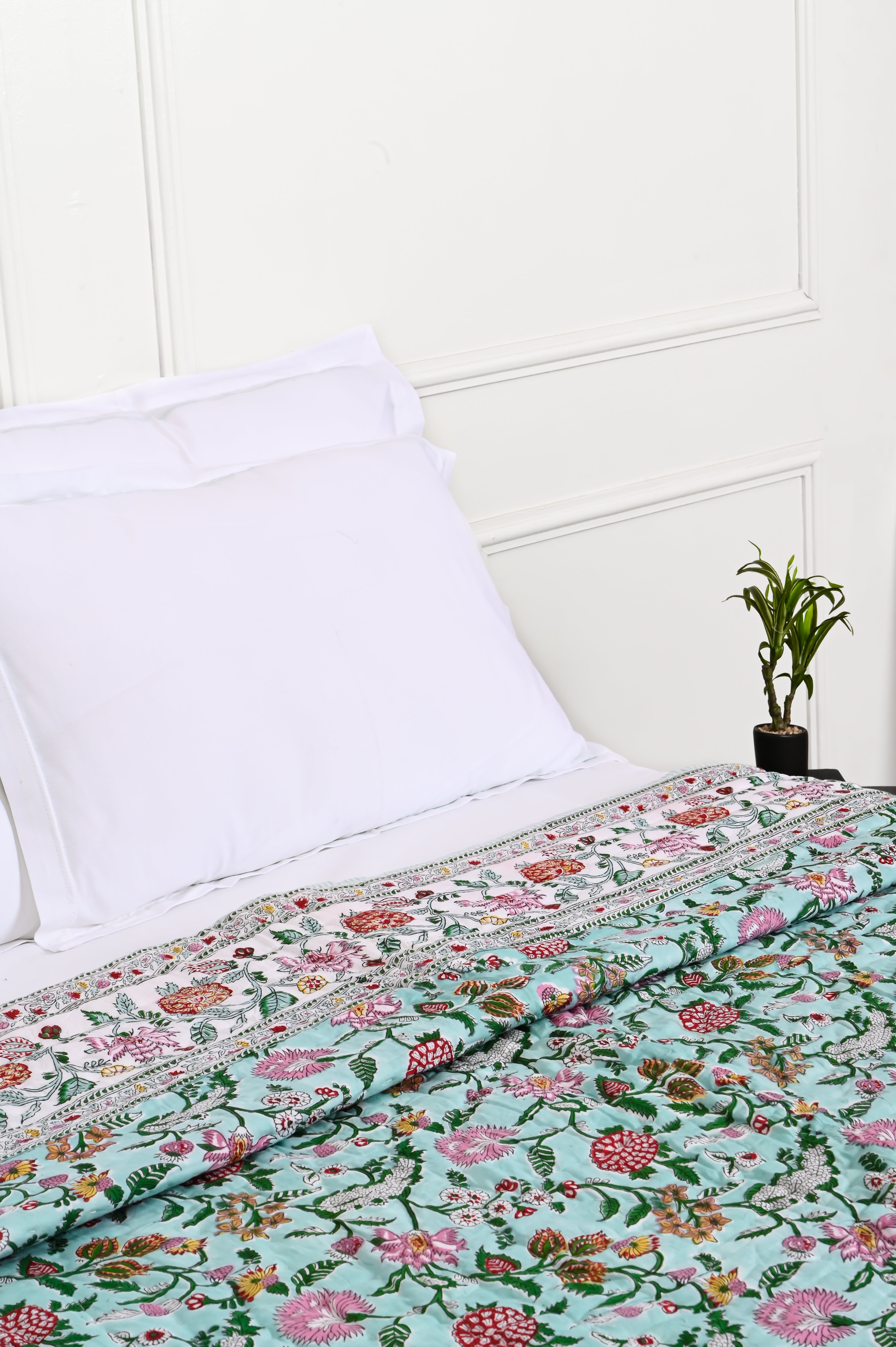 Hand Block Printed Duvet Cover/Quilt - Sea Green Floral