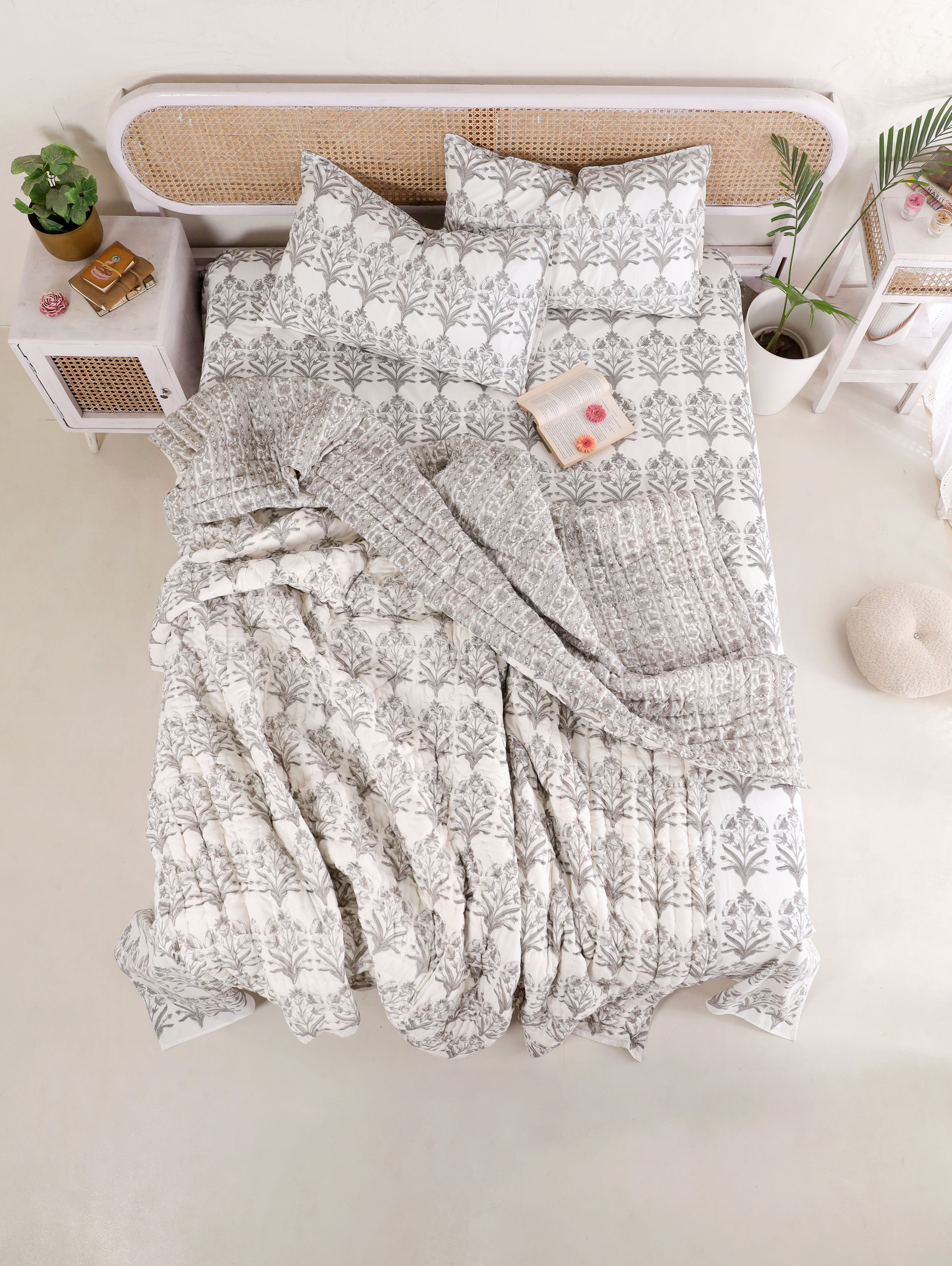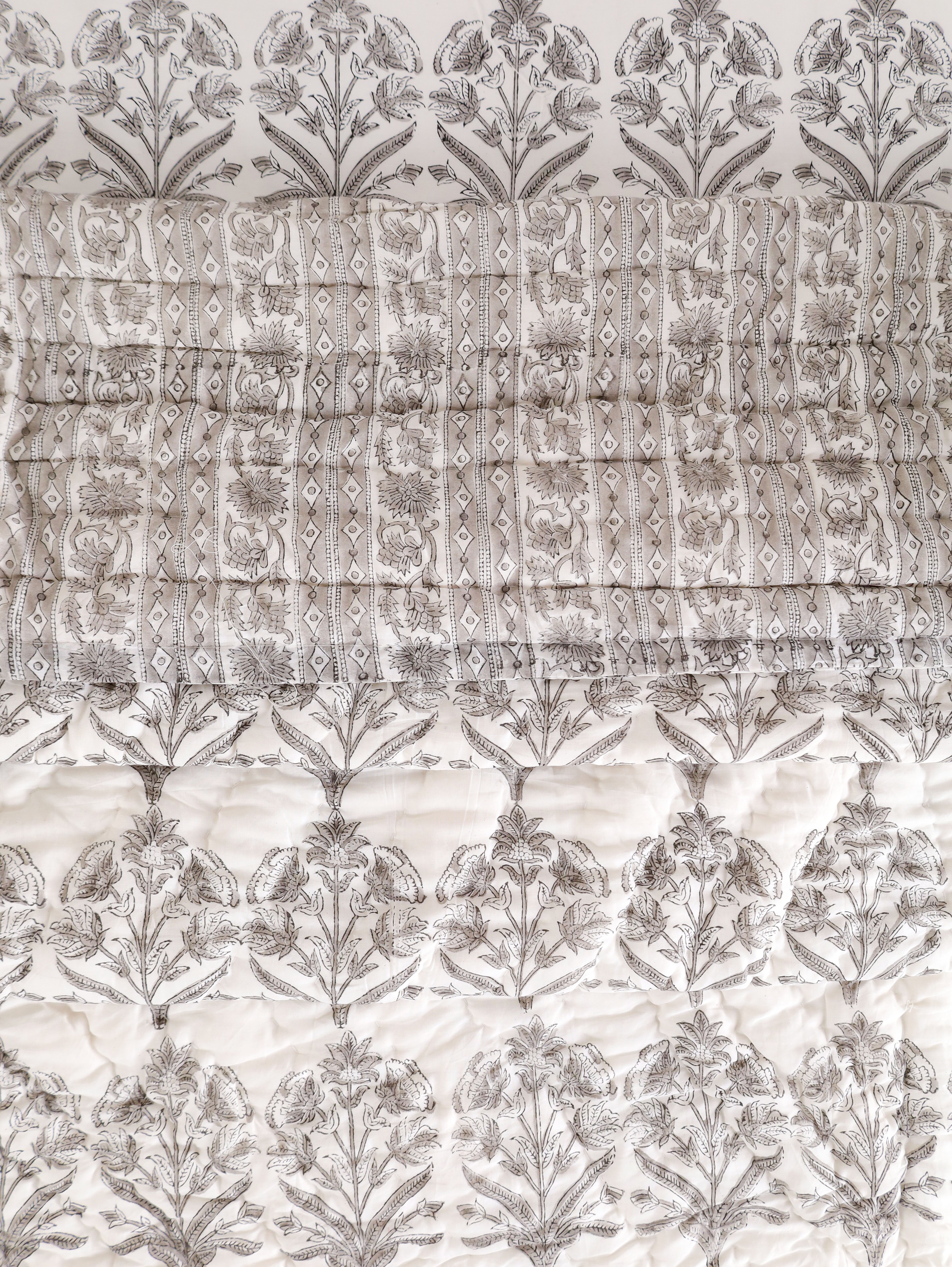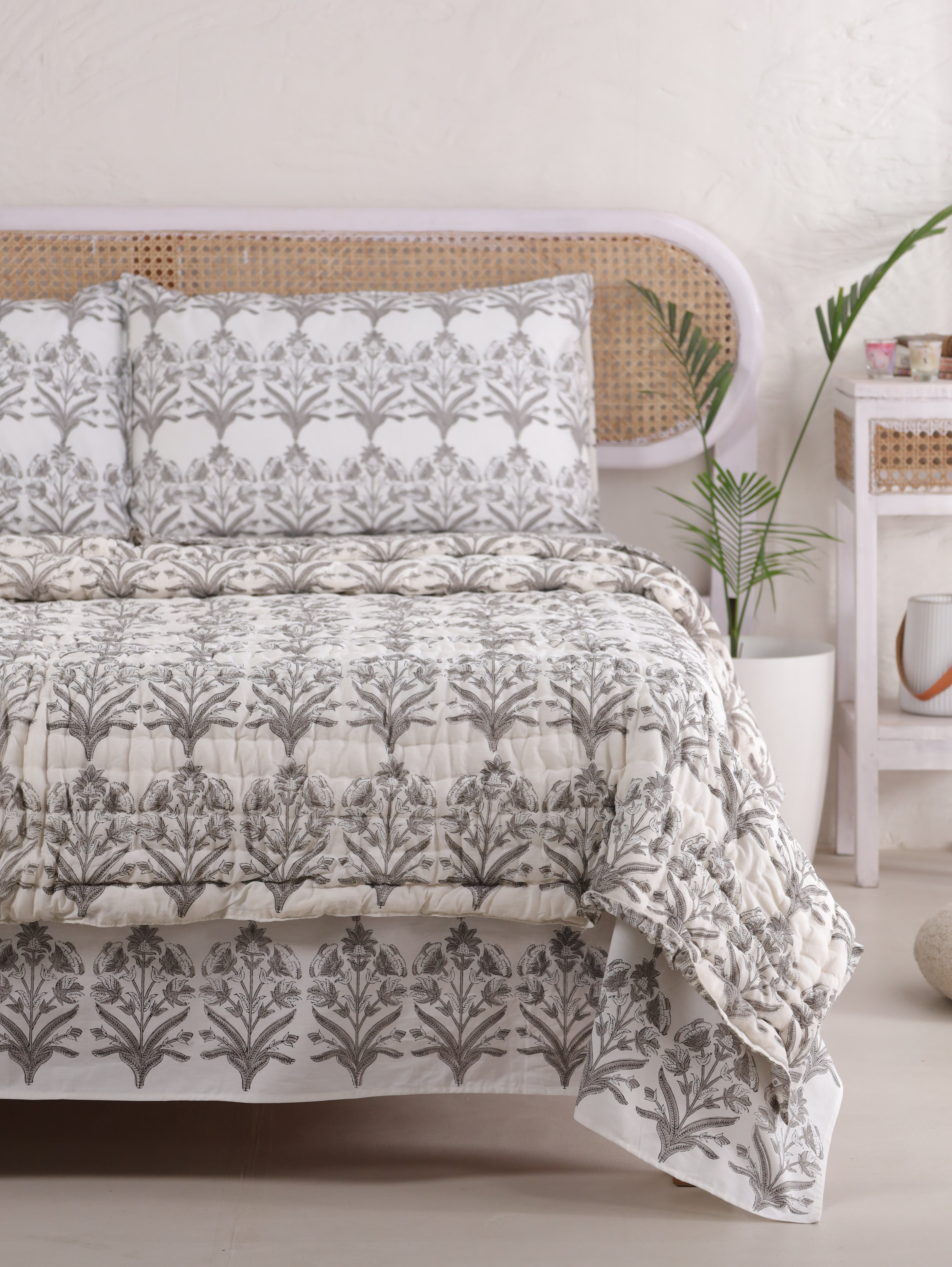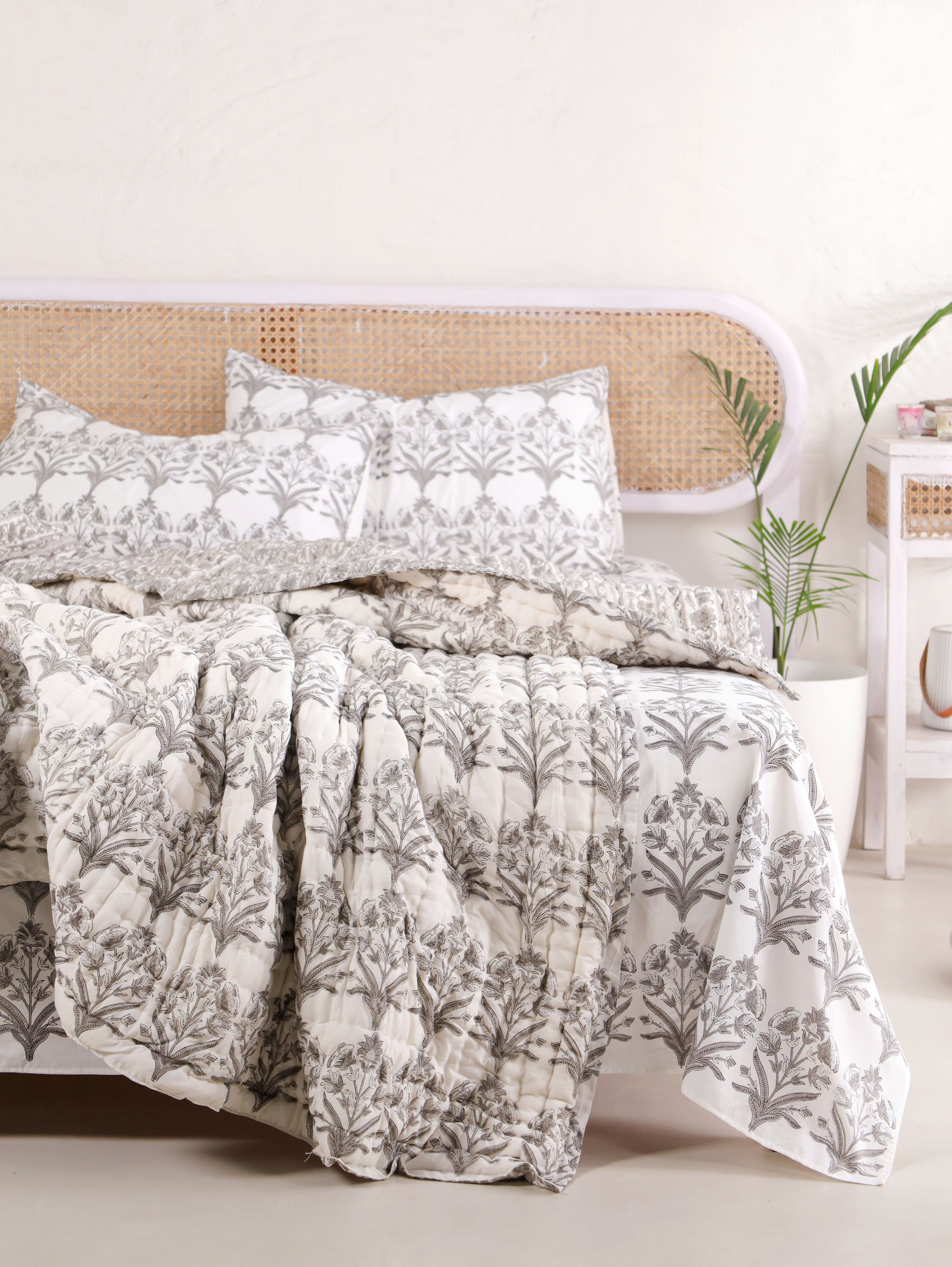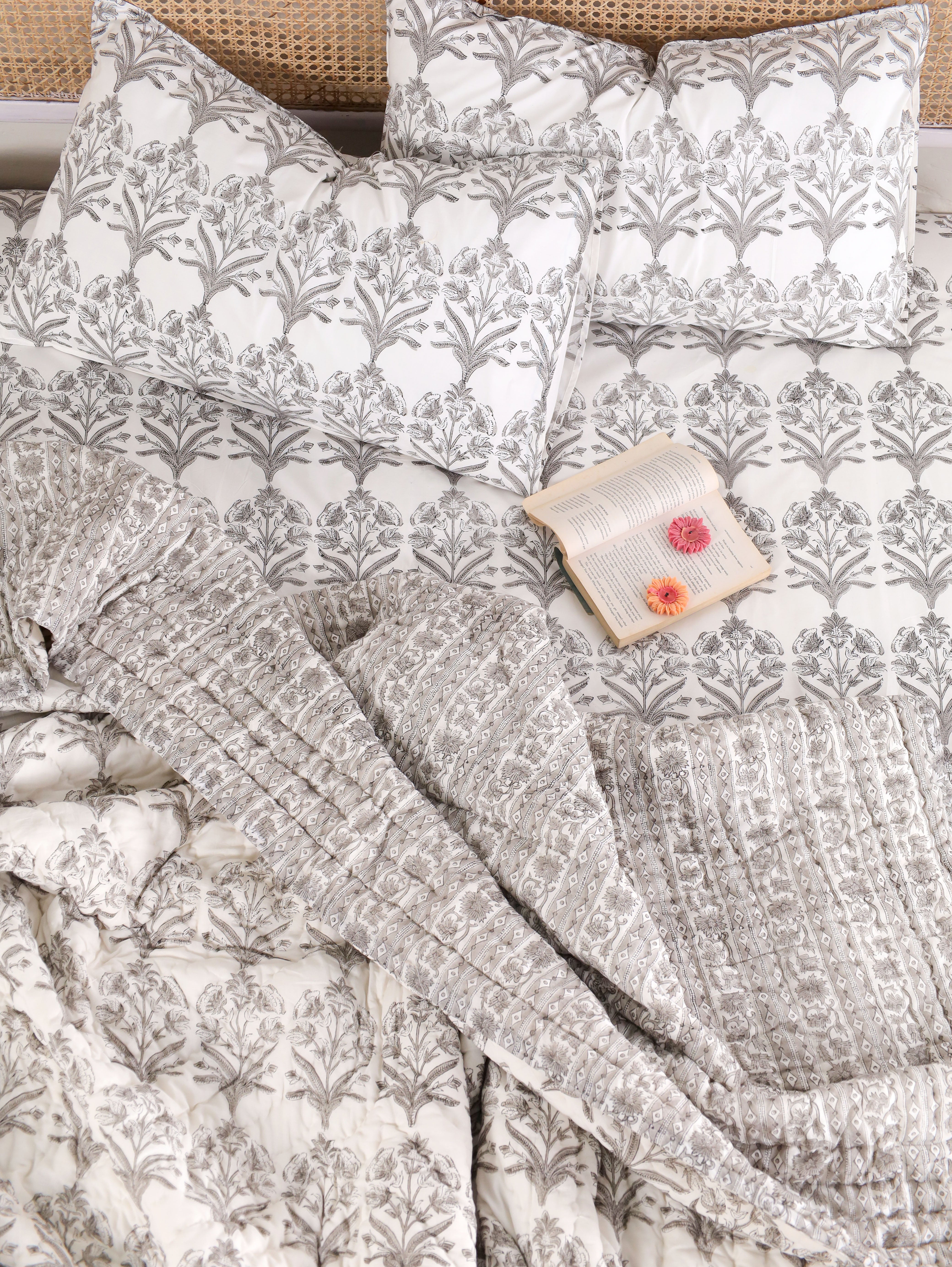 Hand Block Printed Duvet Cover Set - Grey & White Floral
